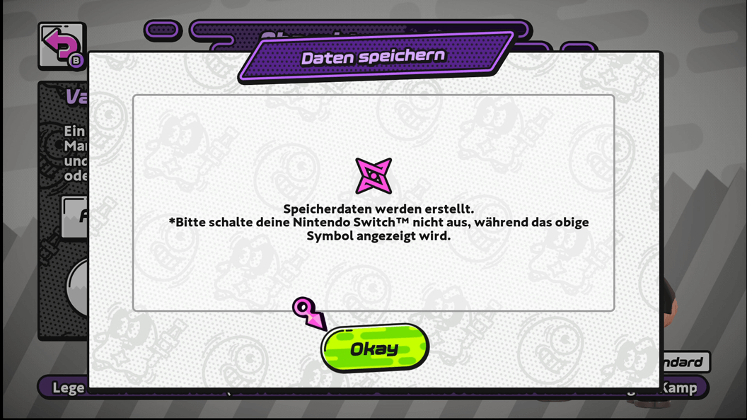 Ein Shuriken-Symbol wird während des Speichervorgangs angezeigt. Bitte schalte deine Nintendo Switch-Konsole nicht aus, wenn das Shuriken-Symbol angezeigt wird.