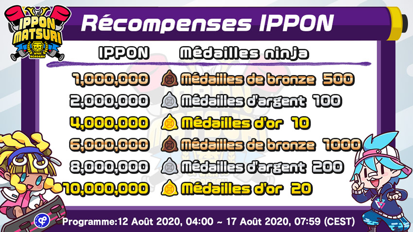 * Des mises à jour sur le nombre total d'ippons marqués seront régulièrement communiquées sur les réseaux sociaux officiels de Ninjala.
