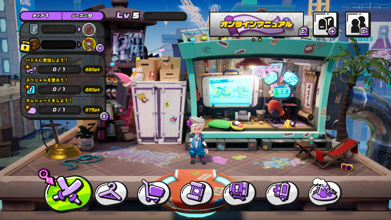 アジト、対戦メニュー、マッチングロビー、戦績などの画面で表示されます。