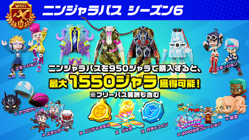 ニンジャラパスはもっと豪華!ニンジャラパスを950ジャラで購入すると、シーズンを通して最大で1350ジャラが獲得できます。