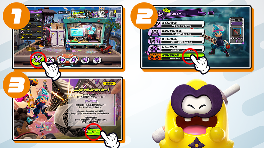 イマドキバトルは、「アジト」→「対戦メニュー」→「イマドキバトル」→「バトル参加」から遊ぶことができます。