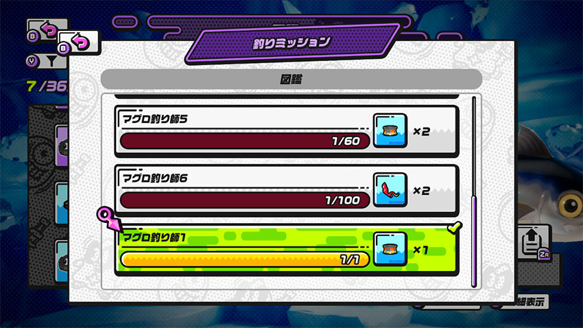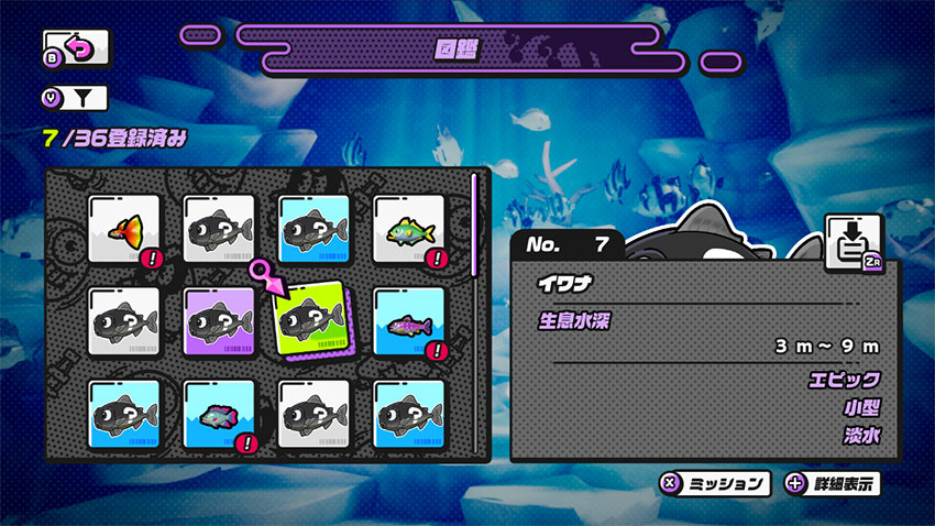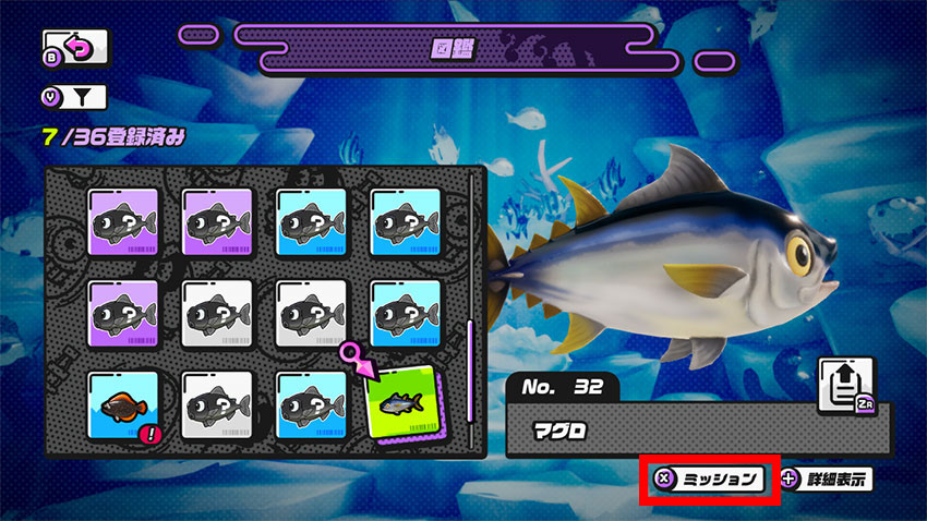 図鑑ミッションは「図鑑」の各魚から確認できる。