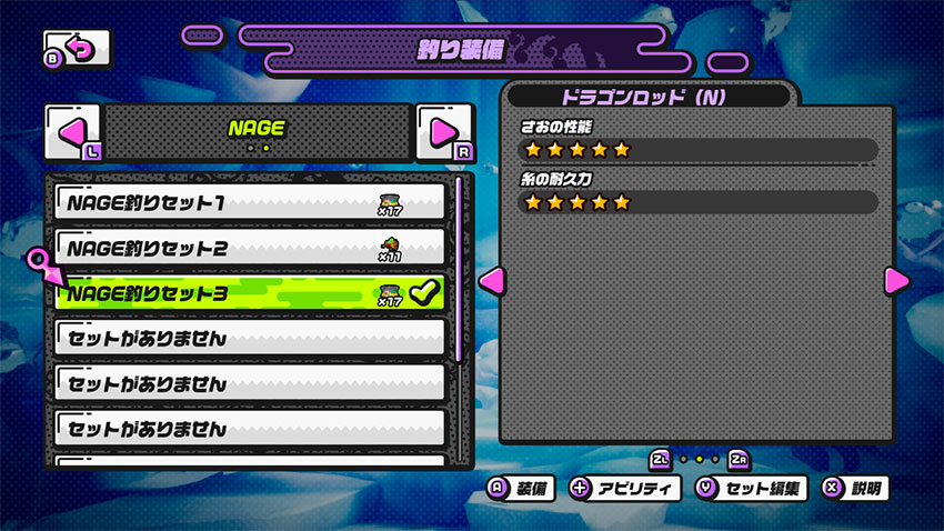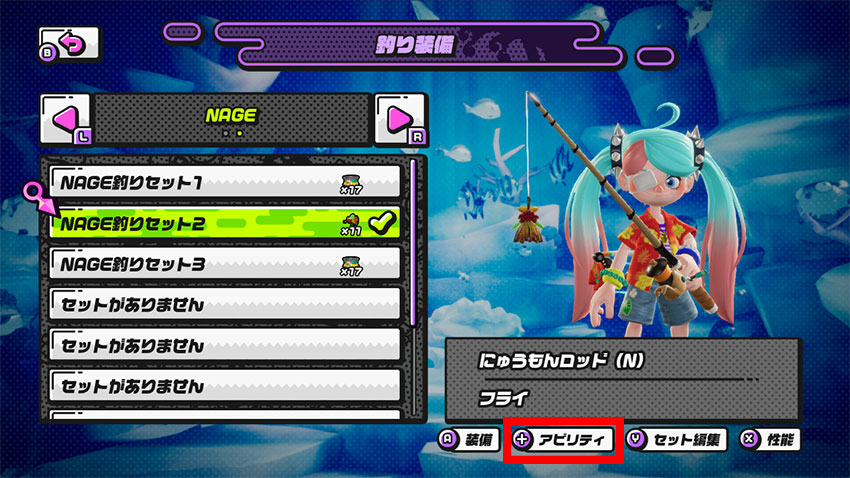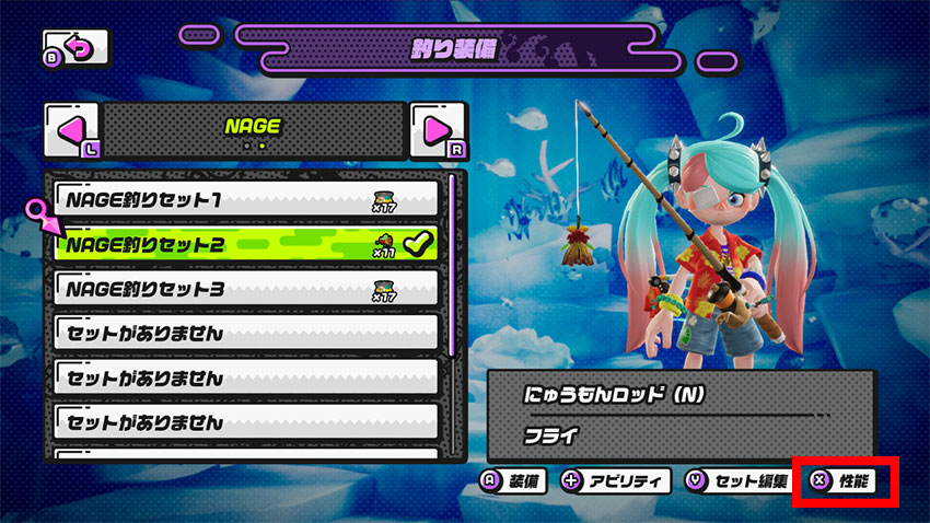 性能は、「釣りポータル」→「装備」→「性能」を選択して、ZLボタン・ZRボタンでページを切り替えて確認することができるぞ!