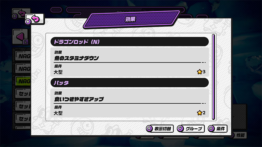 ※釣りざお、エサの「アビリティ」→「グループ」で表示される魚たちは、「条件」に該当する魚の一覧を表示しているもので、その釣りざお、エサで釣りやすい魚の一覧ではありません。