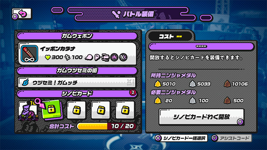 ニンジャメダルを使うことで、新たなシノビカードの入手や、シノビカードの装備数を増やす「シノビカードわく開放」を行うことができます。