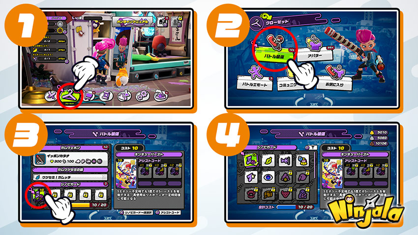 シノビカードは、「アジト」→「クローゼット」→「バトル装備」→「シノビカード」から装備することができます。