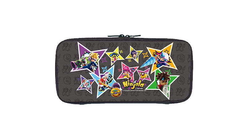 ニンジャラに登場するキャラクターがカラフルな手裏剣と共にデザインされたNintendo Switch専用ポーチ。
