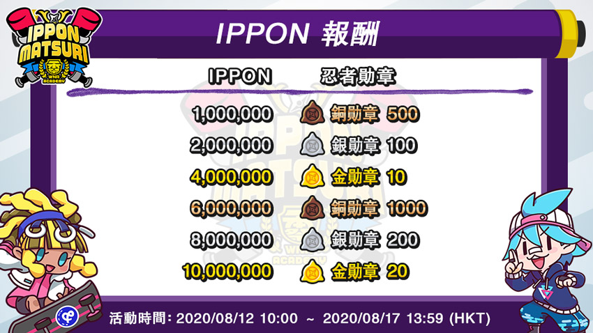 在活動期間,系統將累計所有玩家於「立即開戰」、「Ninjala對戰」及「配對房對戰」中達成IPPON的次數。